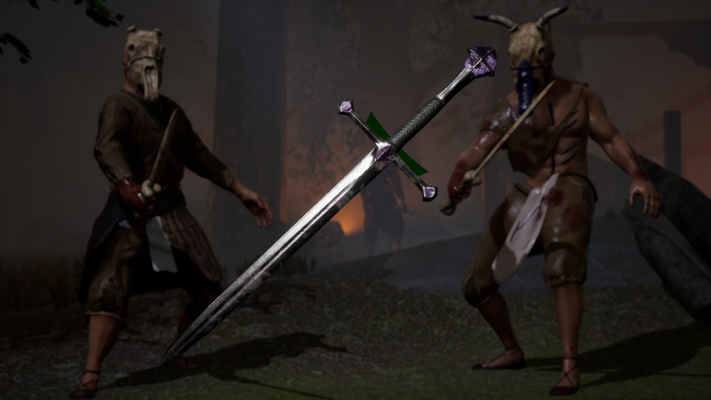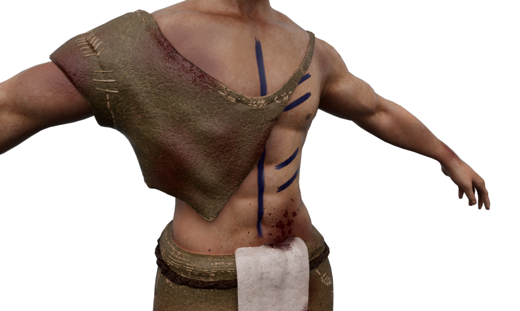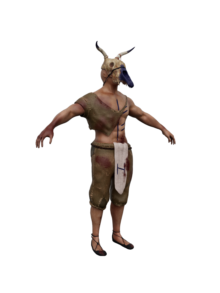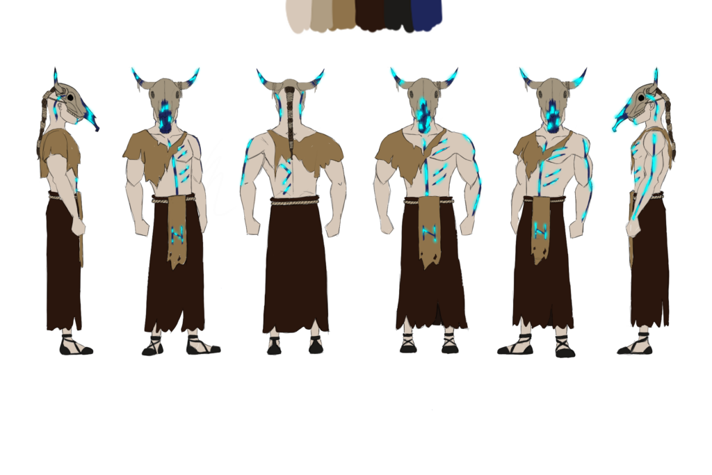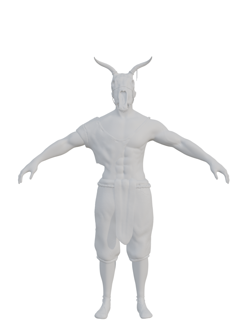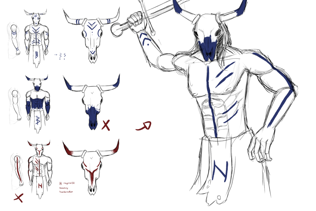 Gemeinsam entwickelten wir erste Ideen zwischen Rittern, Geistern und Fantasy-Maschinen. Da sich der Charakter im Laufe des Spiels transformiert, hat jeder einen davon ausgestaltet. Für den Second Stage Charakter entstand ein Schamane mit tierischen Elementen, inspiriert von Mittelalter, Kelten und Pikten. Zerfetzte Kleidung, Runenbemalung und symbolische Details wie das „H“ für Hagalaz (Transformation) bilden die Grundlage für das 3D-Design.